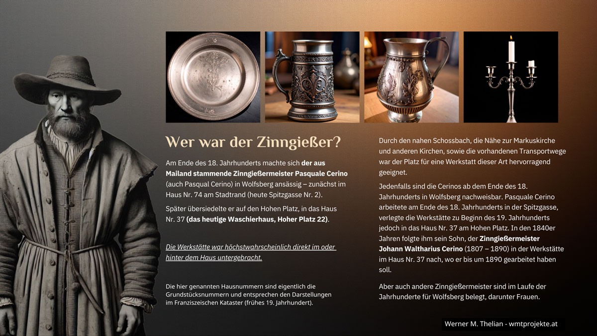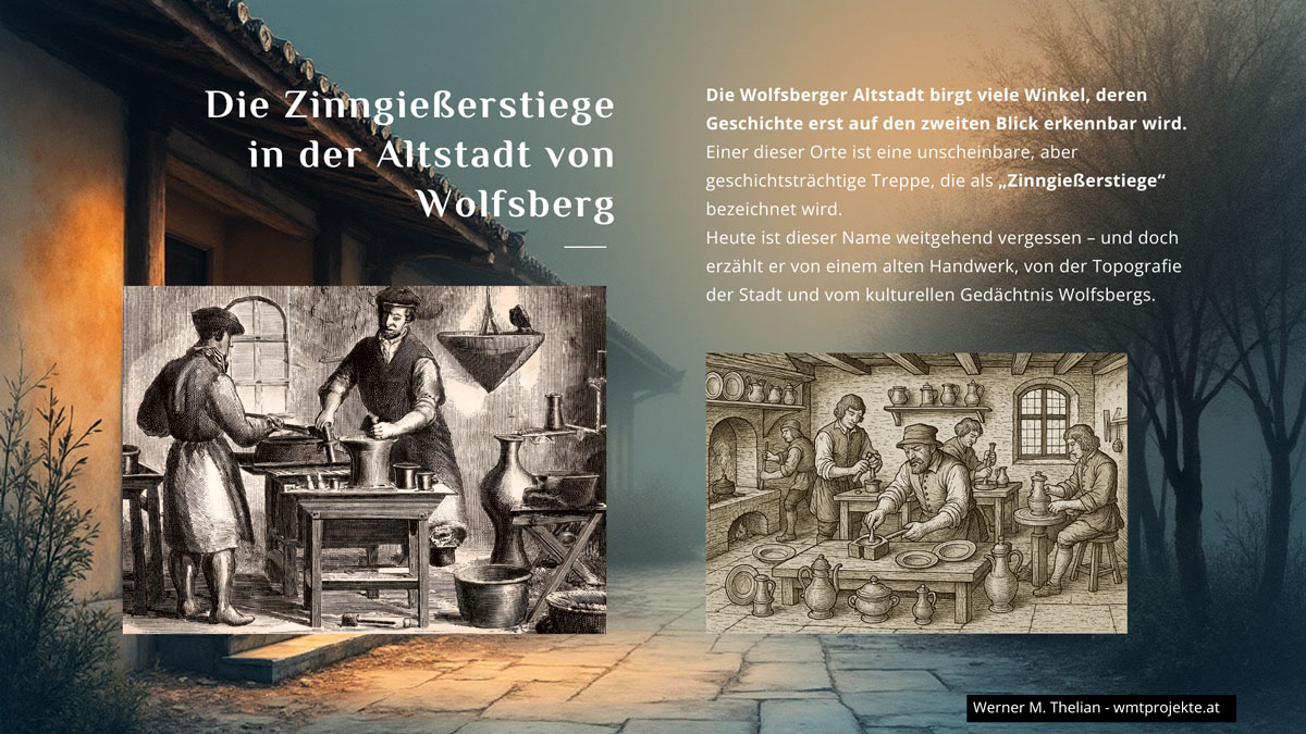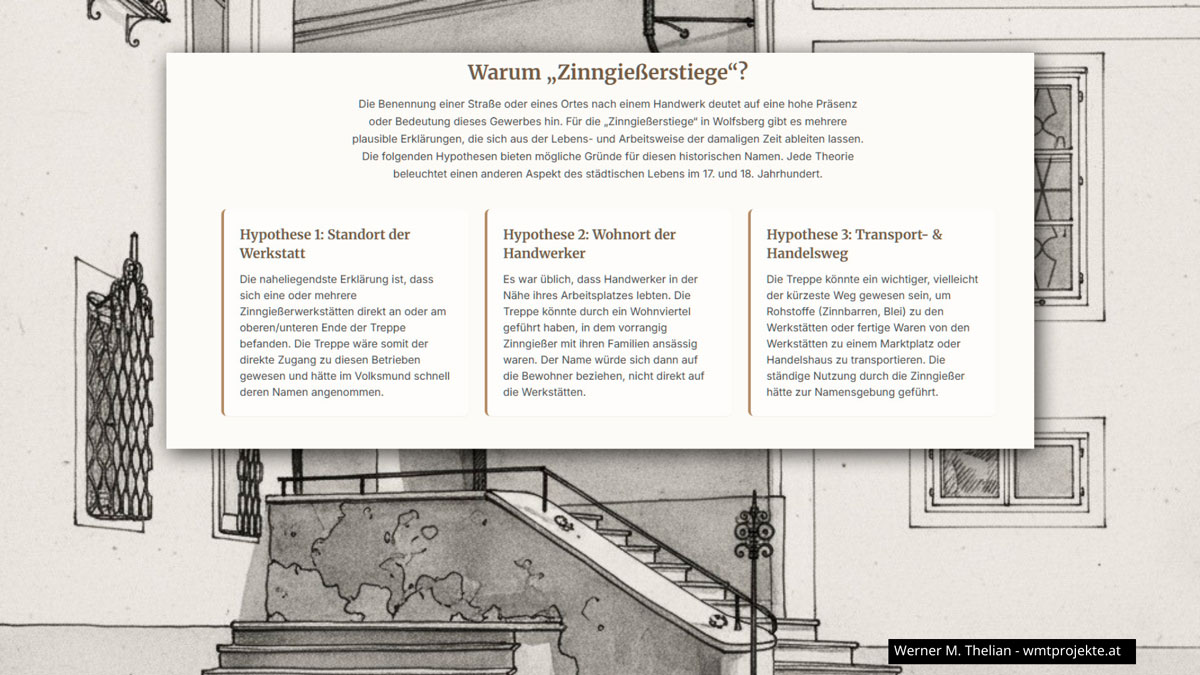 Im Zentrum stand eine Recherchepräsentation mit Konzeptcharakter: nicht nur das Zusammenführen von Material, sondern die Frage, wie sich historische Erkenntnisse so übersetzen lassen, dass sie im Museum ebenso wirken wie draußen am Schauplatz selbst. Die Kombination aus 16-seitiger Präsentation und der Mobilseite unter wmtprojekte.at/zinngiesserstiege/ schafft dafür zwei Zugänge – den vertiefenden Blick im Rahmen der Vorstellung und den jederzeit abrufbaren „Begleiter“ für Besucherinnen und Besucher vor Ort.